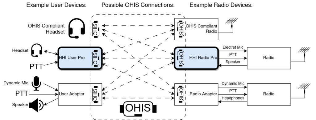 Ideally, radios and headsets would have OHIS-compliant ports on them directly. In 2025, we are early in the adoption of OHIS. Instead, we use adapters, such as HHI Radio Pro and HHI User Pro.