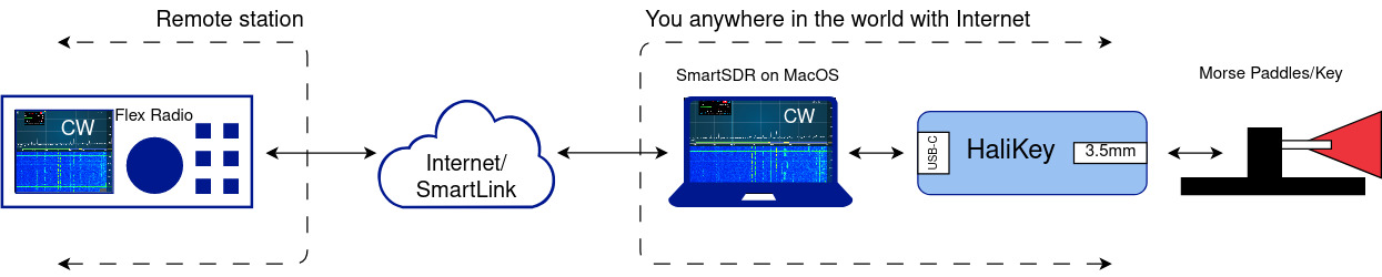 HaliKey is a small USB device that connects morse code paddles (Mac only), or a physical PTT switch (Mac or Windows) to a computer, and allows you to use physical controls when operating your Flex radio remotely.